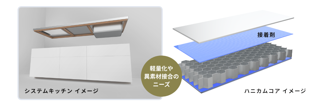 また、素材の多様化にともなう新たな接合手段には、熱膨張係数の異なる素材の組み合わせに必要な耐久性などが求められています。それらの課題を接着工法により解決いたします。