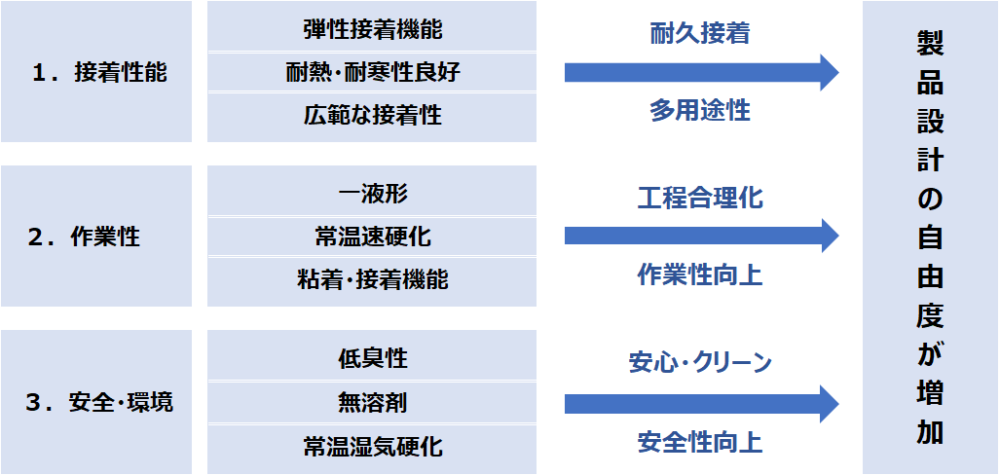 セメダインスーパーX№8008Lブラックは『粘着接着』と『弾性接着』そして『無溶剤』という三大特長を備えた接着剤です。