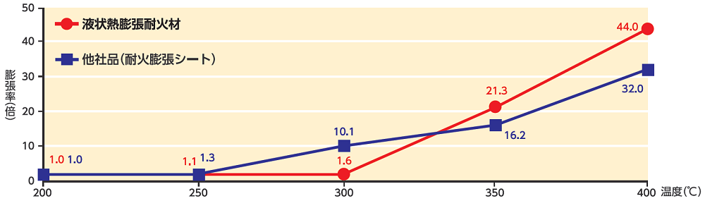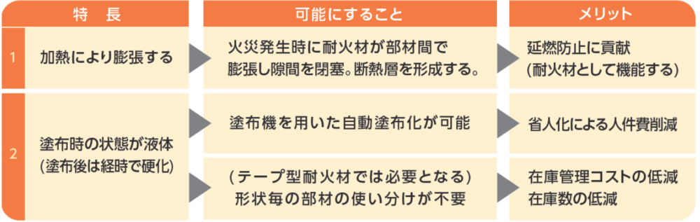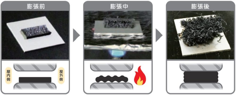 耐火・防火性能が求められる建築物の様々な場所に、事前に塗布・施工しておく液状の膨張耐火材です。火災発生時など200℃以上に加熱されると膨張して空隙を塞ぎ、延焼を遅延させます。UL94V-0相当の難燃性と優れた断熱性があり、建築物の延焼防止に貢献します。