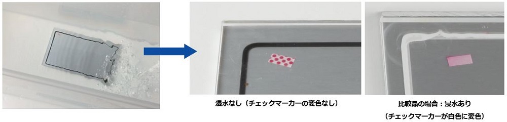 3.続いて、本試験片を水深1.5mに30分浸漬後、水没管理シールの変色有無により枠内への浸水有無を確認。(=IPX8相当)