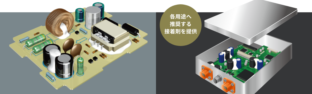車載をはじめとする様々な製品で必要不可欠であるDCDCやDCAC、インバーターで、部品のガタ防止、放熱、シールといった様々な用途に接着剤が使用されております。セメダインの製品は弾性接着剤であるため、衝撃や熱に強いという特長があります。更に接着剤中に低分子環状シロキサンを含有せず、接点障害を引き起こしません。