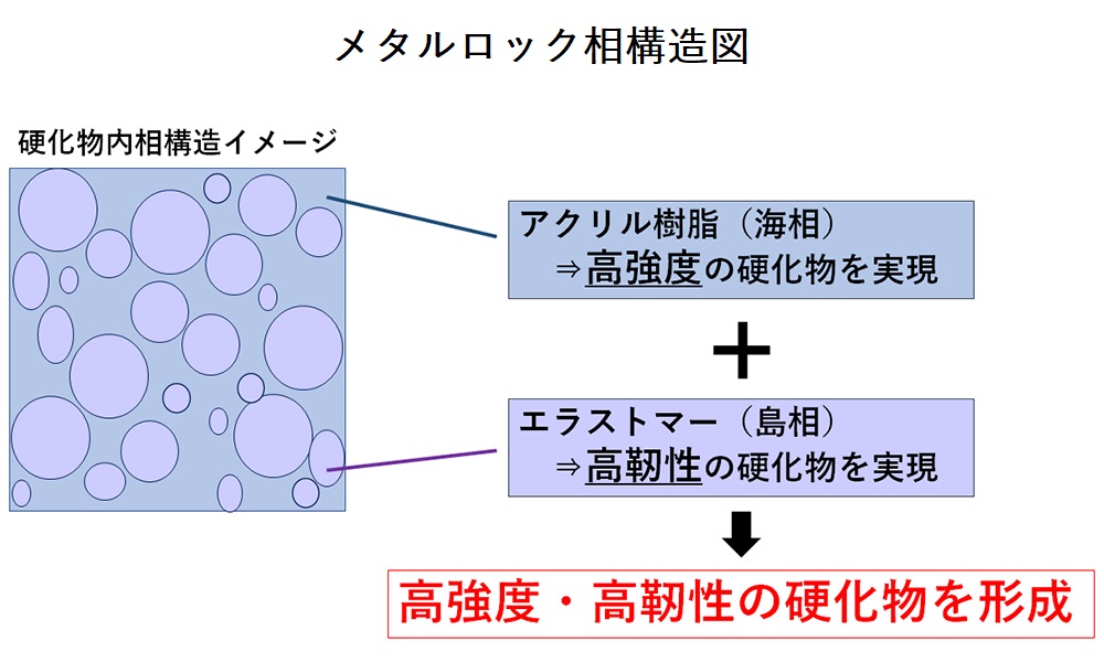 第二世代アクリル樹脂系接着剤(以下、SGA)とは、硬く強度の高いアクリル樹脂と、ゴム成分が硬化物内に共存することにより、強靭な接着性を形成する接着剤です。