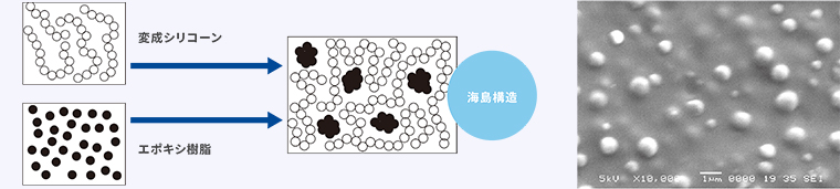 海島構造となることにより、変成シリコーンの特長であるゴム状弾性とエポキシ樹脂の特長である種々の材料に対する接着性が得られます。
