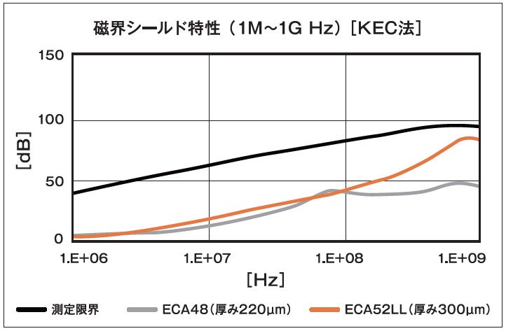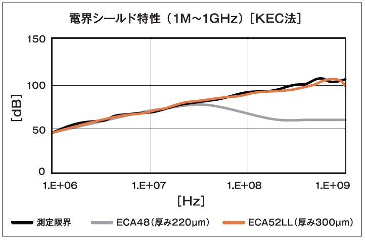 ・KEC法:硬化条件にて硬化させた接着剤シートを150×150mmカット。KEC法シールド特性測定システム(㈱テクノサイエンスジャパン製)により、1MHz~1GHzまでの電界シールド特性、及び磁界シールド特性を測定。