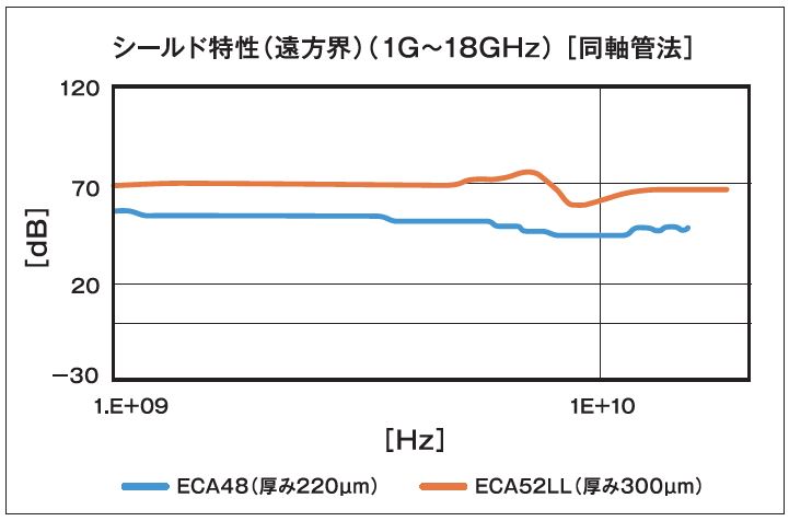 ・同軸管法:ASTM D4935に準拠。硬化条件にて硬化させた接着剤シートを、外径12mm内径2.5mmの円盤型にカット。GPC7の治具にセットし同軸管タイプ シールド効果測定システムにより、1GHz~18GHzまでのシールド特性を測定。