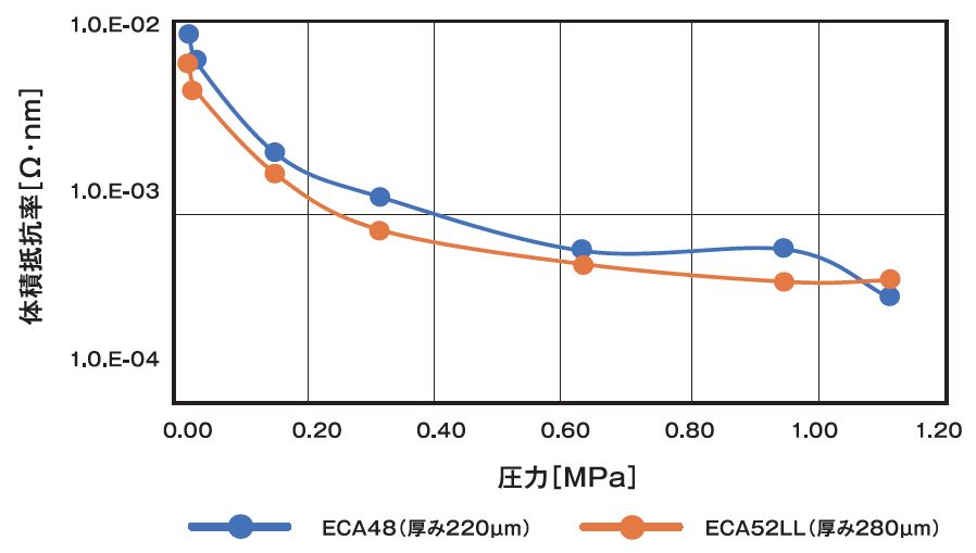・接着剤シート厚み:ECA48(220μm), ECA52LL(280μm)硬化条件にて硬化させた接着剤シートを、φ20mmの円型にカット。カットしたシートの厚みを厚み計で実測し、接触抵抗測定器にセット、印加電流1A, 印加電圧1Vを印加。荷重を5, 10, 50・・・Nと変化させて各荷重ごとの体積低効率を測定