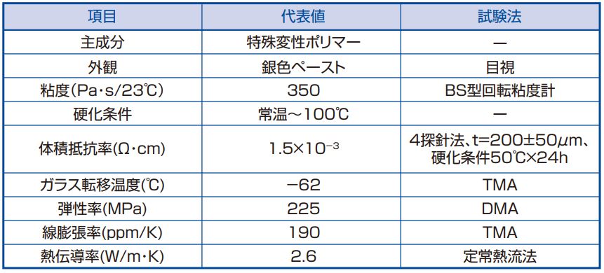 - 多くの熱膨張係数が異なる基材間で、良好な接着性と、優れたヒートサイクル性を有する事により、高い接着耐久性を保持します