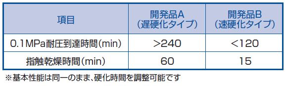 - 2液混合により硬化開始するため、湿気硬化型と異なり密閉条件下や乾燥条件下でも硬化のコントロールが容易です